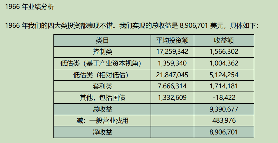 巴菲特:去年,相对低估类取得了此类别设立以来的最高收益,主要得益于一笔投资,它是我们 1965 年末的规模最大的投资,也是我们 1966 年末规模最大的投资(美国运通)。我们持有这笔投资以来,它每年(1964、1965、1966)都遥遥领先大市。任何一年的表现都很难说,但是我们认为,把时间拉长到三四年,这笔投资将来取得优异表现的概率非常大。