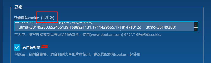 启用防封禁:必须开启,豆瓣存在拉取限制,一旦超出上限就会被封禁6小时,若被封禁,家庭带宽可以重启路由器更换动态公网ip来规避封禁; -