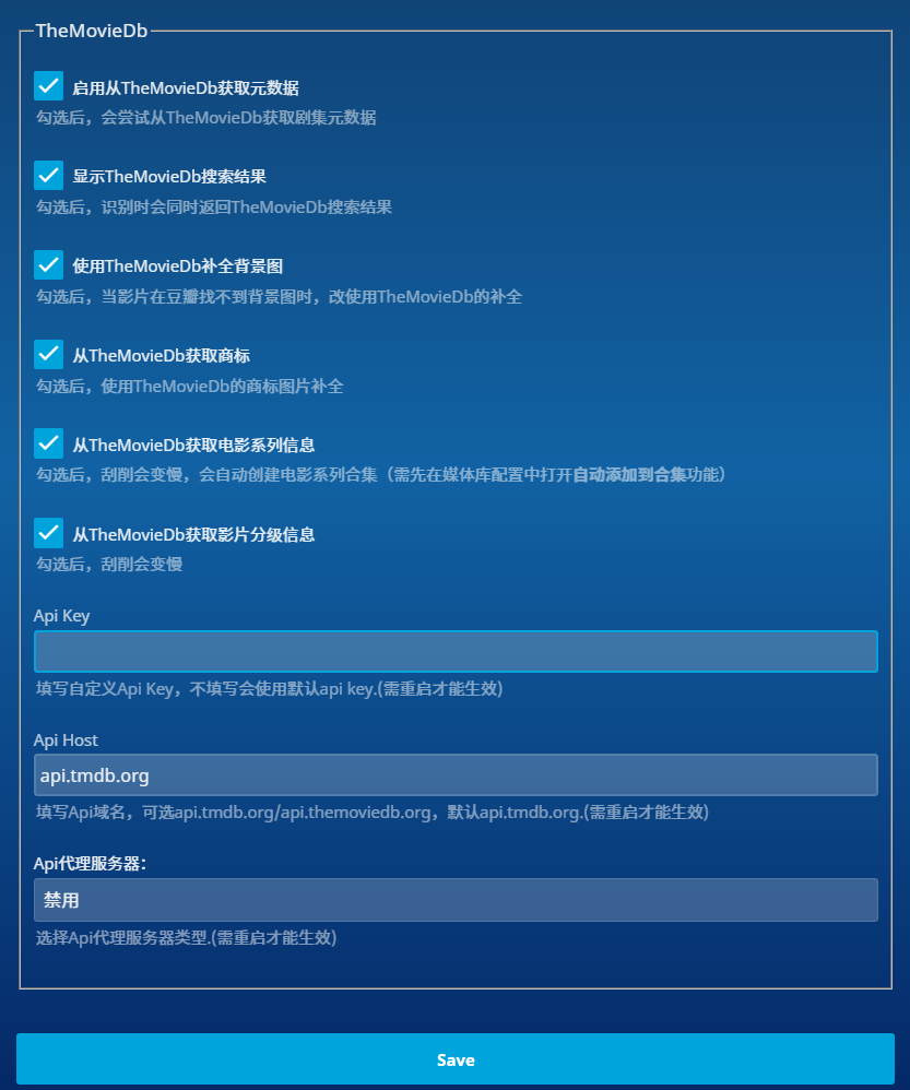 TMDB配置作为豆瓣缺少资源时的补充下载,可根据实际需要自行配置; -