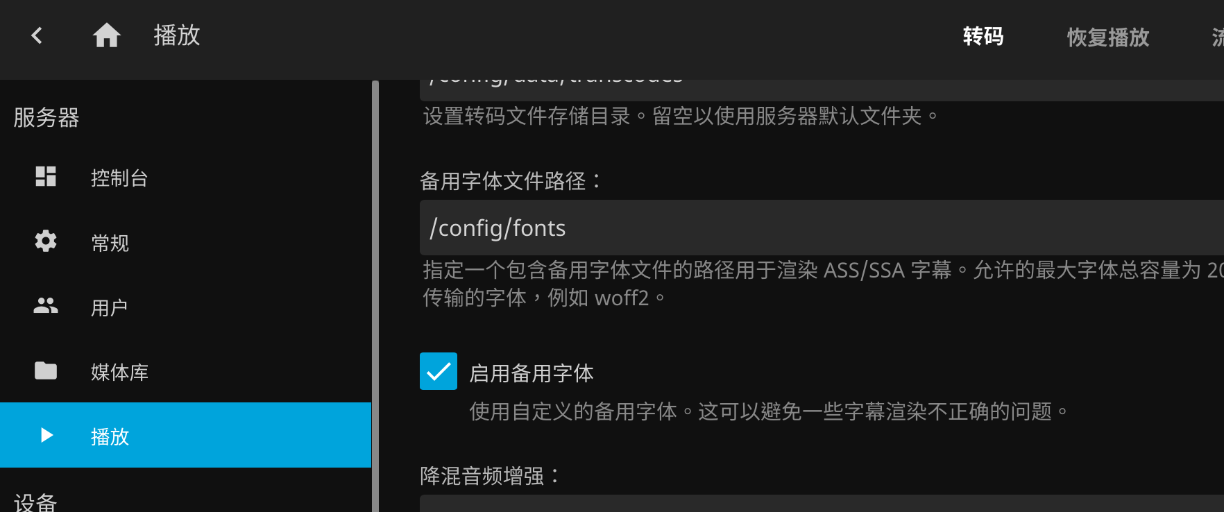 然后在控制台-播放中设置启用备用字体: